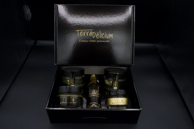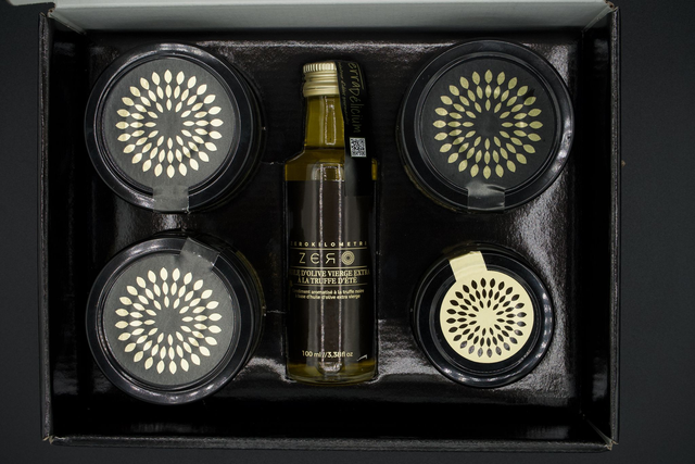coffret composé de 3 pots 90/100 gr. (poids net) de crèmes de légumes à la truffe d'été 5%, d'1 bouteille 100 ml (poids net) d'1 condiment (huile d'olive) aromatisé et d'1 pot 50 gr. (poids net) de lamelles de truffe d'été. Les crèmes sont :